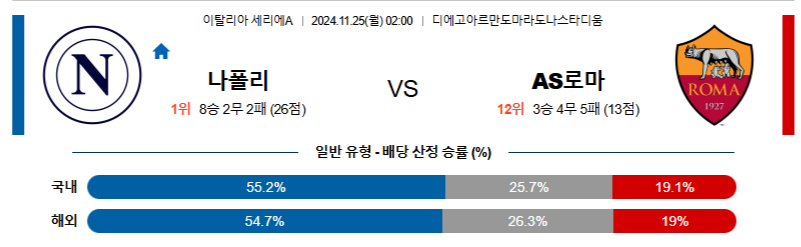 - 나폴리는 최근 5번의 맞대결에서 3승 1무 1패로 우위를 점하고 있습니다. 특히 홈 경기에서 로마를 상대로 안정적인 경기 운영을 보여왔습니다. 반면 로마는 원정 경기에서 나폴리를 상대로 최근 몇 년간 승리가 없다는 점이 약점으로 작용할 수 있습니다.